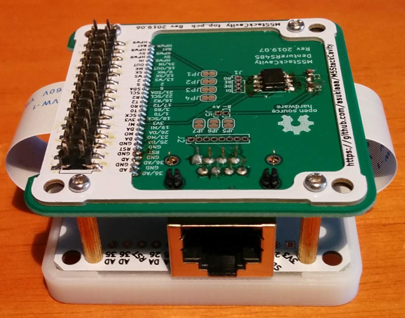 そこで、背の高い部品をM5Stackからはみ出さずに使えるように、上下の部品をリボンケーブルで接続したM5StackCavityという装置を作ってみました。