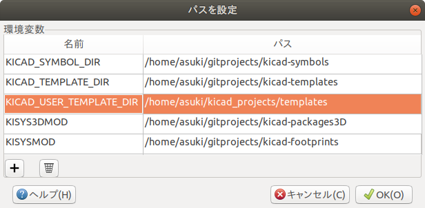KICAD_USER_TEMPLATE_DIRを自分がテンプレート用のプロジェクトを配置したいフォルダのパスに変更します。