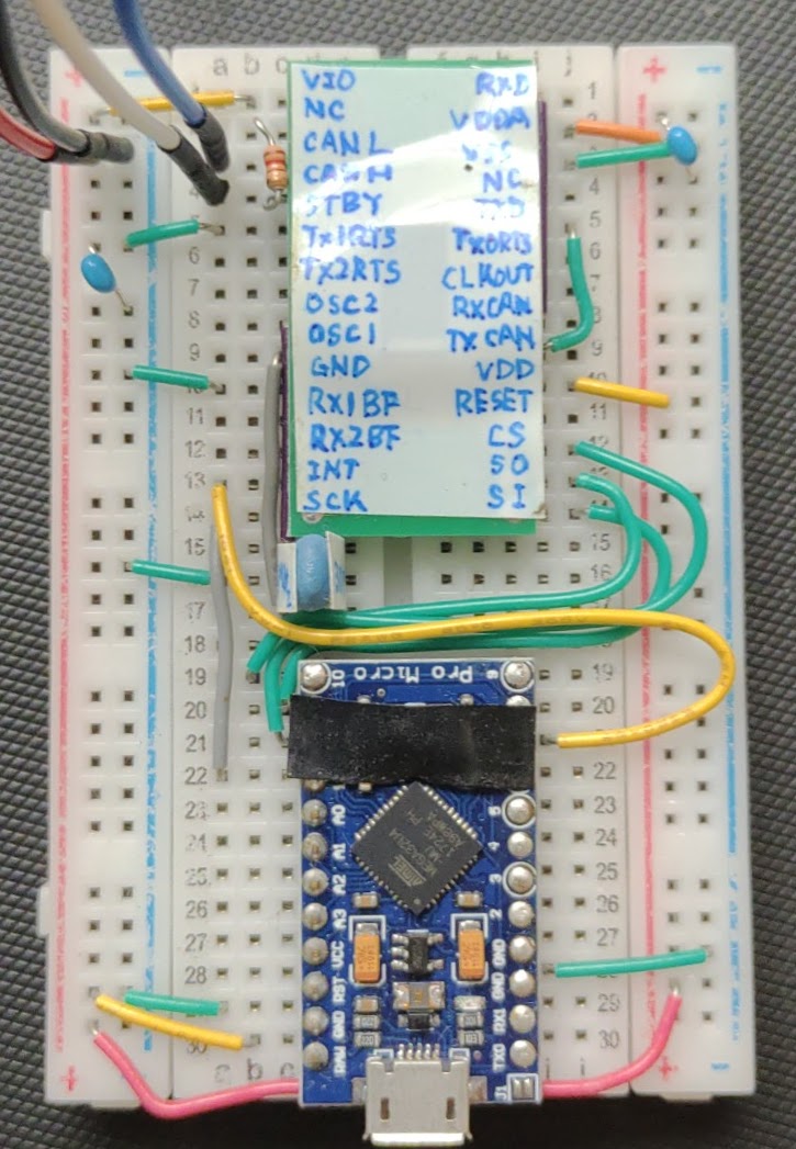 ProMicroなどのArduinoはCANの回路を持っていないので、このようなICを通してCANを利用します。