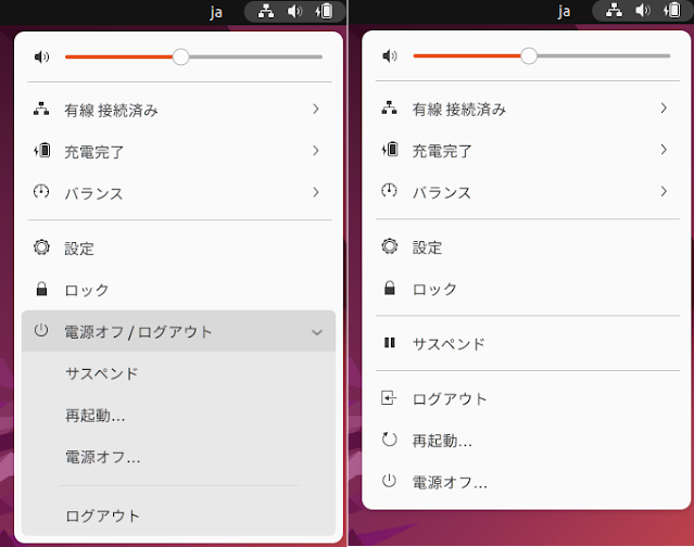Ubuntu22.04の画面右上から選べる「電源オフ」は、標準の並びだと「電源オフ/ログアウト」の中の下から2番目に配置されていrます。サスペンドやログアウトより電源オフをよく使う自分としては、操作間違いでログアウトを選ぶことが度々あったので、間違いを減らすため順序を変更しました。