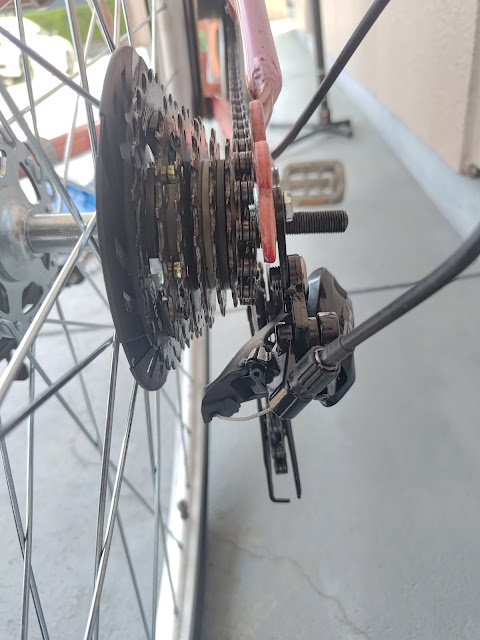 ハンガーを曲げてディレーラーをスプロケットと平行にしたことで、端のギアにも変速が入りやすくなりました。